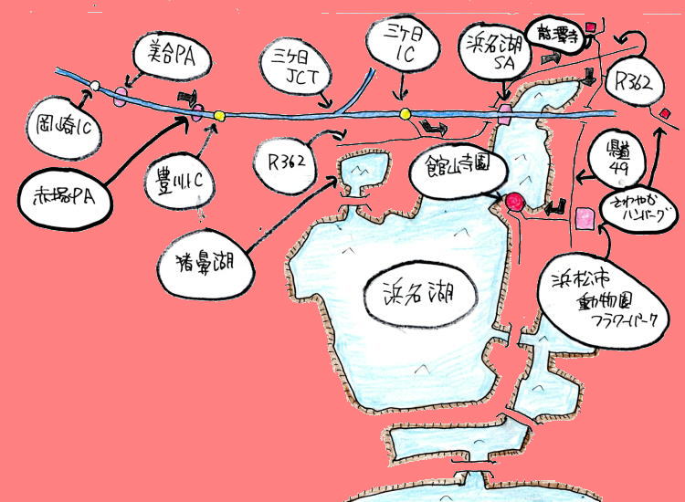 | ルート | 美合PA~東名高速~三ヶ日IC~R362~県道49~県道320~舘山寺温泉~舘山寺園(昼食)~同コース帰路へ 距離 約55km(美合PA~舘山寺園) |