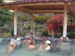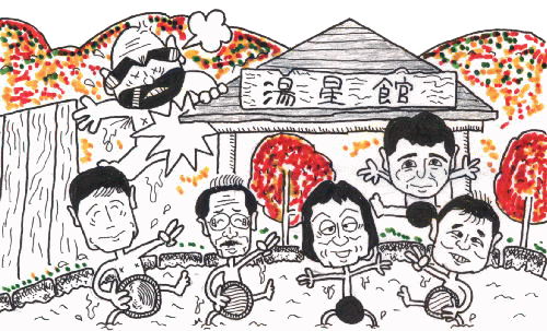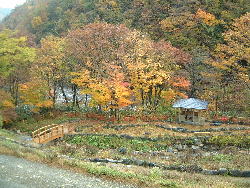 | 小雨の中を小川峠の素晴らしい紅葉を満喫してから入浴した「湯星館」の露天風呂は紅葉も眺められて良かったです。 会長さんは飛び上がって喜んで大切なところを××××××でしたぁぁと、しておこう。 |
