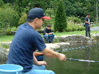 | 緑と清々しい涼風の中で釣り大会を開始したもののなかなか釣れずに大苦戦をする住職さんを尻目に皆大漁に大満足でしたよね。 |