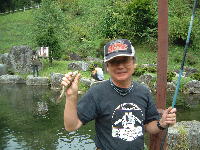 坂道に強いですね、後を見るとやっぱ会長さんたちが見えない!路側帯で止まっていると来た来た上りは辛そうですねぇー。車屋に到着するとつもさん一家が愛犬を連れて待って居た、早速竿とエサを持って釣りの開始です。以前はエサはイクラだったけど、今は練り餌だから合わせのタイミングが難しいのです。タイミングが遅いと餌だけ取られるし、早すぎると合わないのです。