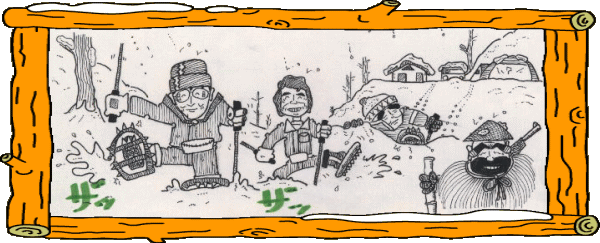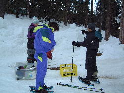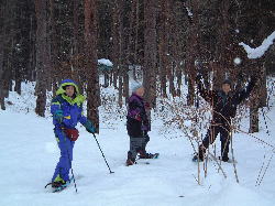 | 設営を早めに終えて「まっち先生」の山歩きの授業の始まりです。昔はかんじき、今はスノーシューですね。「またぎの叔父さーん、スノーシューにしたらぁ」 |