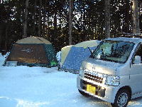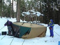 | 下はタープにテント設営です。ドームタープは冬のキャンプでも威力を発揮しました。サイトまでは圧雪路ですので4WDにスタッドレスが一番。 |