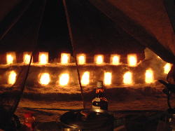 | 今回も登山とハイキング専門店のまっちさんの企画で出かけました。会場の手配から荷物の分担までお世話になります。今回のメインはキャンドルを灯して、その明かりを眺めながら語り明かそう・・・と、言うものです。 夜空の星、月明かりに照らされた雪原はとても素晴らしいものでした。 |