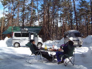 | 楽しい一夜が終わると又現実の世界へ戻る時間になりますよね。旅の終わりはどうも寂しくってダメです。 ゆっくりと片付けの終わったサイトでコーヒータイムを楽しんで、白鳥町の美人の湯で疲れを取ってから帰宅しました。HPをご覧になった皆さんも一度雪中キャンプをしてみませんか、楽しい事この上ないですに。 |