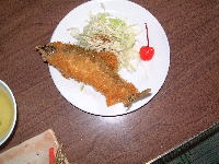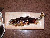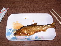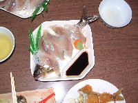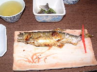 | 昼食時間の正午の少し前に対岸にある「やな場」へ 歩いて向かいます。皆さんお腹が空いていて足早 でしたよ。 川面では鮎釣りの釣り人が何人が出てました。 |