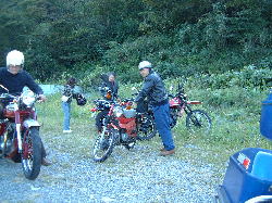 | 出発は午前9時30分です。皆さんそれぞれに準備に かかりました。 綺麗にレストアされた1969年式ホンダドリーム CB750K0は一宮のKさんのものです。 |