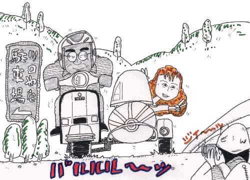 | 昼食会場へ行く前に記念撮影です。可愛いサイドカー、 バジャイチェタック+コージーロケット150cc年式は新しい 2004年式です。でも旧車のような雰囲気は良いですね。 そのサイドカーを前にして「撮りま〜す!」。 |