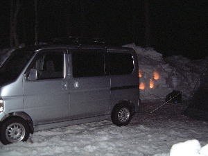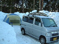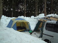 | 1b50aはある雪の壁に囲まれたテントサイト。凍結していて駐車するのに苦労しました。 |