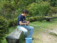 午前10時30分過ぎても誰も来ないので車屋に向けて人間7人と犬1匹で出発、ネバーランドから車屋までは30分弱の距離で、着いた時には既に数人の家族連れが釣りをやっていた。我々も早速釣りを始めたけど今日は魚の餌の食い気が悪い様子です、中々餌を食ってくれない、それでも待望のアタリがあって合わせるも上げる前に池ポチャ!悔しい、すぐ気を取り直して待望の1匹目をゲット!