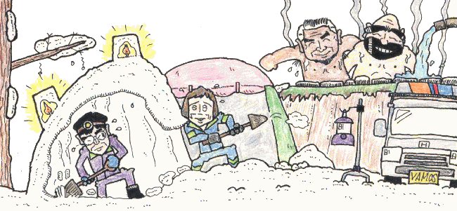 二次会は「かまくら」の中で深夜まで続きました。CDを聞きながらのお喋りはいつの間にか人生談義?になってましたよ。 CDに流れる巨人の星のテーマに「思いこんだらって、重い物を何で込むんだろうとおもってた」なんて言う話しにハハハハハッと笑うのみ。 中は大人4人が余裕に入れて真ん中には小さなテーブルが置けます。 就寝は午前1時になっていたのを記憶してますがねぇぇ〜。 |