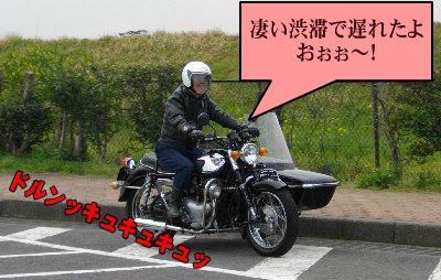 岡崎から参加のWの源さんはカワサキW1改+ジュピターサイドカーですり抜けもできずでスタート5分前に到着。遅れるのは途中まで源さんと一緒に走っていたタケちゃんからの伝言で分かっていたのでスタートを若干遅らせる。源さん、ご苦労様ぁ〜!