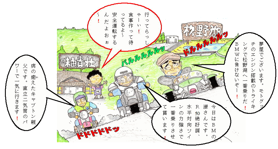 集まった旧車ライダー達はいじる事も好きだが走る事も大好きだ。それに負けず嫌いが多いと思う。春の松野湖まで一番乗りをかけて走る男達の運命やいかに。「安全運転でねぇ~」と女将さんの声が聞こえたりしてね。