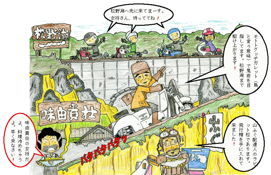 R21の鬼岩ドライブイン近くから駆け上がれば陸王愛走会主催で集いが行われていた松野湖駐車場へ出る。その手前の堤防道路を走るのは昨年の申年のモンキーと今年の酉年のモトグッチガレットだ。ガレットは鳥と言う意味らしい。