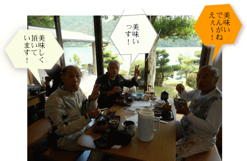 イカ丼を味わう参加の皆さん。左~JF2YVUの長いお付き合いのMさん、我が倶楽部の平さん、平さんのお友達Kさんだ。湖を眺めながらの食事は最高だね。