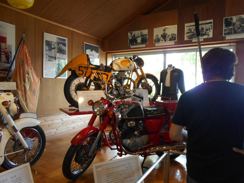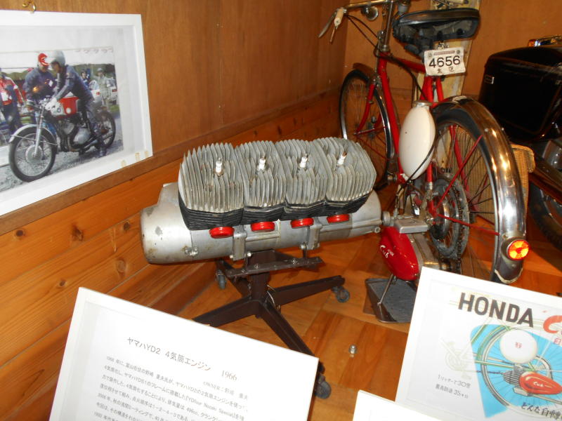 浅間火山博物館の入り口を通らないと二輪資料館へし行けません。以前はそのまま行けたのにね。 火山博物館の入り口にも山田輪盛館のホスクにホンダとヤマハのバイクが展示してあった。 |