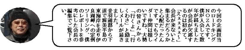 | 今回は欠席、申し訳ありませんでした。皆さんで協力してのツーリング、楽しめたようでホッとしています。次回からの参加も難しいのでご迷惑かけますが宜しくお願いします。 HP担当 団栗村の住職さん |