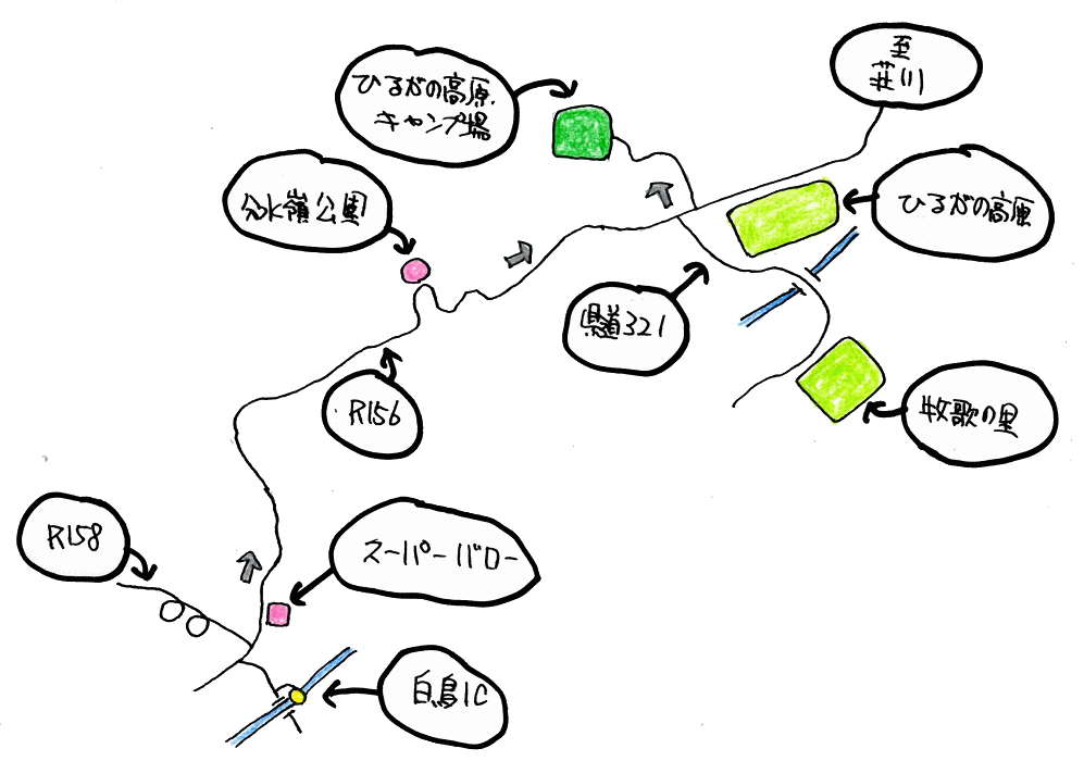 買い出し後はR156を走りウイングヒルズやダイナランドのスキー場への分岐を通り超して行く。段々と標高は上がりひるがの高原分水嶺手前の峠を駆け上がる。 案内に従いガソリンスタンドの脇を左へと入り二股を右へ直進すればキャンプ場だ。 |