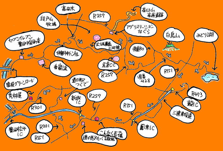 距離 セブンイレブン~みどり湖(70km) みどり湖~こんたく長篠(37km) こんたく~秀枡屋(50km) 合計 約157km |