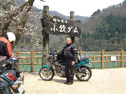 小牧ダムの看板前でポーズを取る善さん。善さんのスパーダ250は、九州などを走破して15万qを越えています。 |