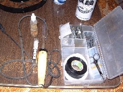 無線機の不調は配線の断線でした。ベテランライダーがいると色々な修理道具出てきます。二次会前にハンダゴテを持って・・・ |